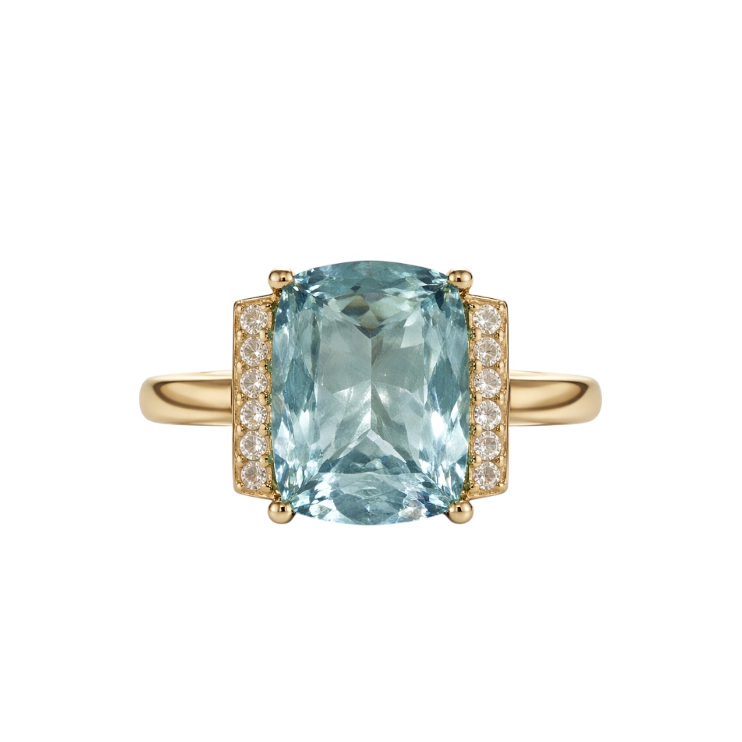 A luminous cushion-cut aquamarine sits beautifully at the centre of this refined gold design. Its tranquil ocean-blue hue is enhanced by the warmth of polished yellow gold, creating a striking yet harmonious contrast.