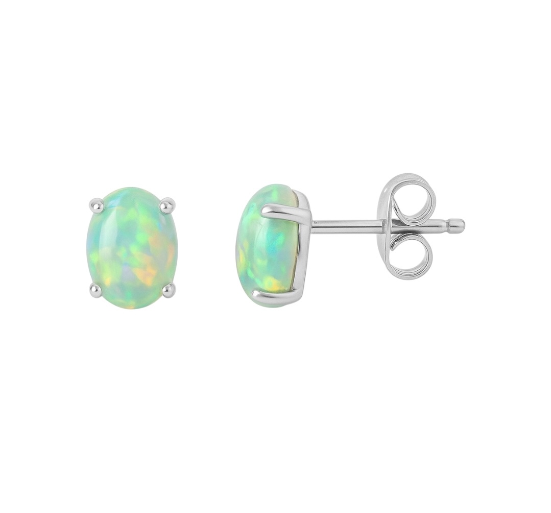 These Ethiopian opal studs display a stunning array of shifting colors , glint of green, blue, that change with the light. The oval cabochon opals are set in polished sterling silver with secure butterfly backs, offering a clean, luminous look that captures the natural beauty of each stone.