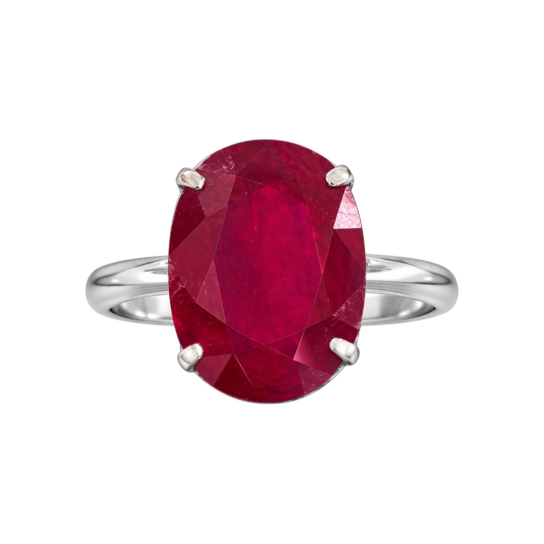 A bold statement piece featuring a rich, deep red ruby in a classic oval cut. The stone is generously sized and set high, allowing light to pass through the facets and enhance its natural depth and colour. Four claw prongs secure the gemstone, while the elevated setting showcases delicate openwork detailing beneath the stone.
