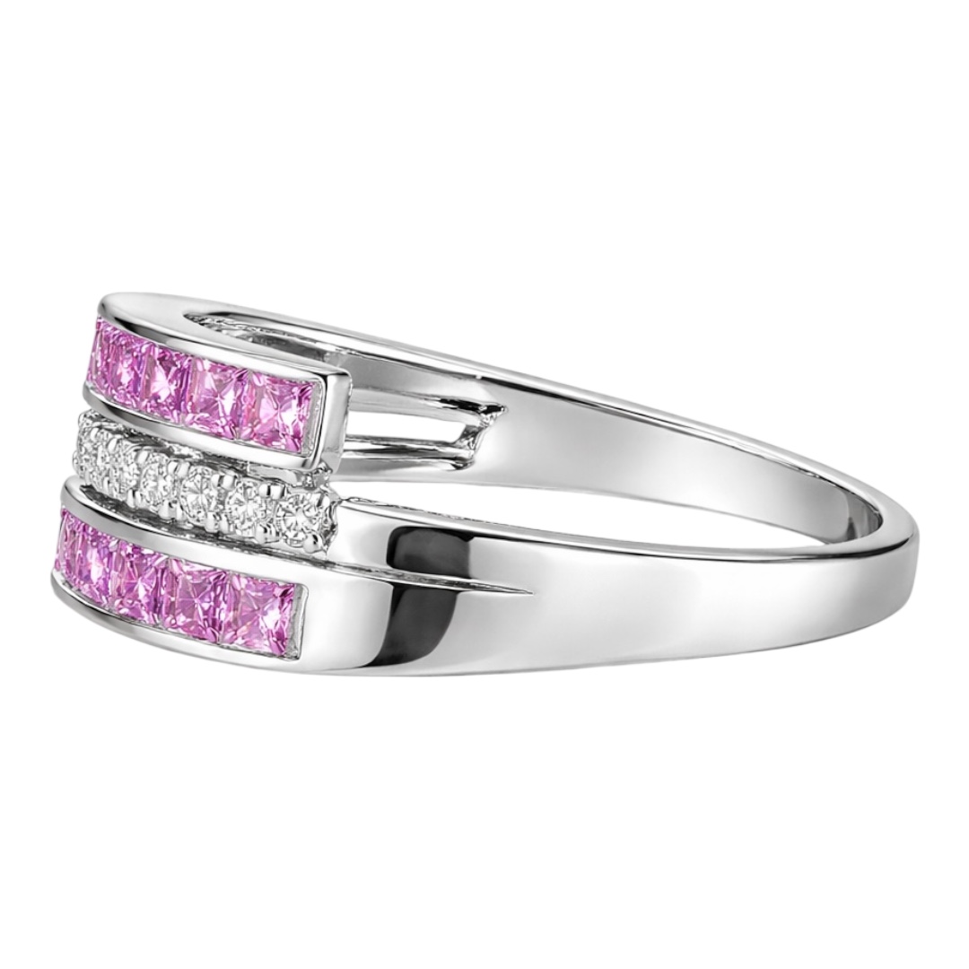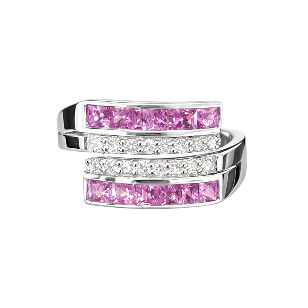 A modern wrap-style ring featuring two parallel rows of vibrant pink sapphires, accented by a central band of sparkling diamonds. The open, layered design creates depth and dimension, with each row sitting slightly offset for a contemporary look. The polished silver finish enhances the contrast between the soft pink tones and the brilliance of the diamonds, while the side profile reveals the smooth, sculpted band and precise stone setting.