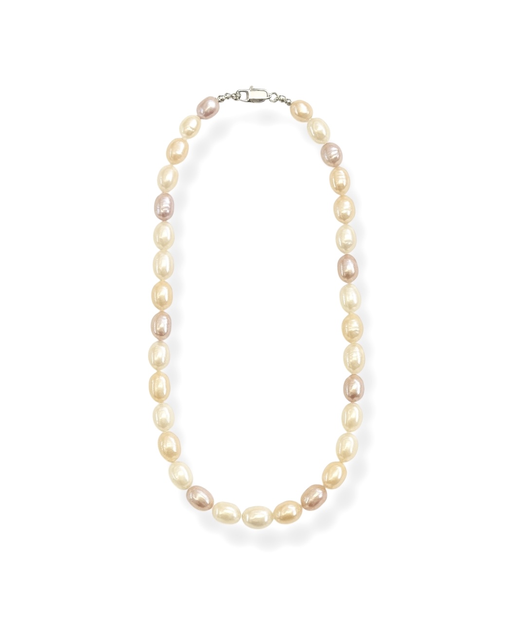 Oval Freshwater Pearl Multi coloured Necklace. Silk Knotted. Plated Silver Clasp.