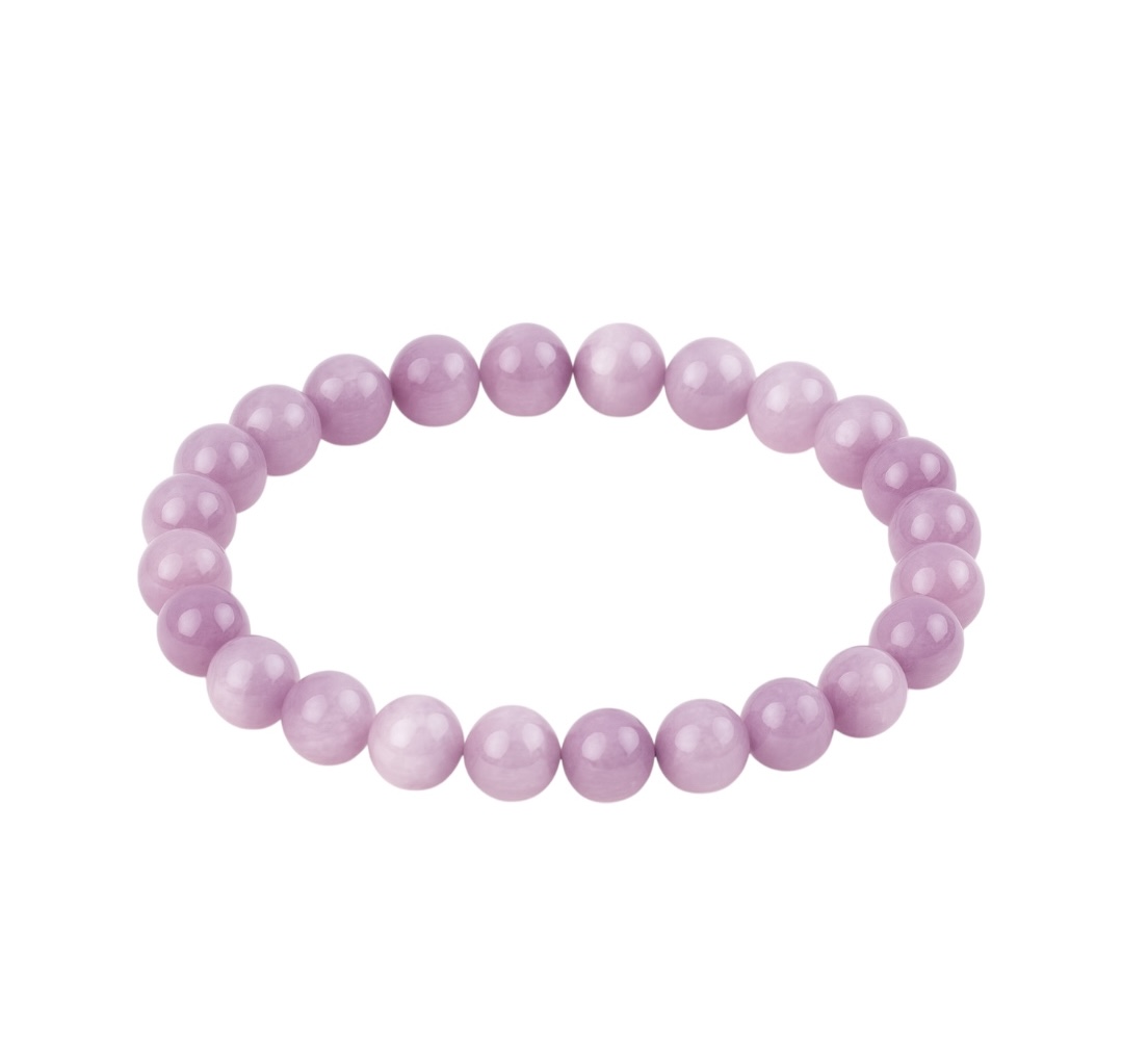 This bracelet features smooth 8mm Lavender Kunzite beads in soft lilac tones, polished to a gentle, luminous sheen. Known for its calming appearance and naturally subtle variations, each bead offers a beautiful blend of pastel purples. Strung on durable stretch cord for a comfortable fit, this piece adds a delicate, feminine touch to any jewellery collection.