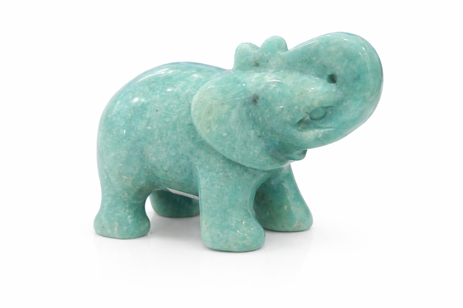 A beautifully hand-carved elephant figurine crafted from natural amazonite, showcasing soft blue-green tones with subtle white marbling and natural inclusions. The polished finish enhances the stone’s gentle lustre, while the smooth, rounded form highlights the elephant’s raised trunk, curved ears, and sturdy stance.
