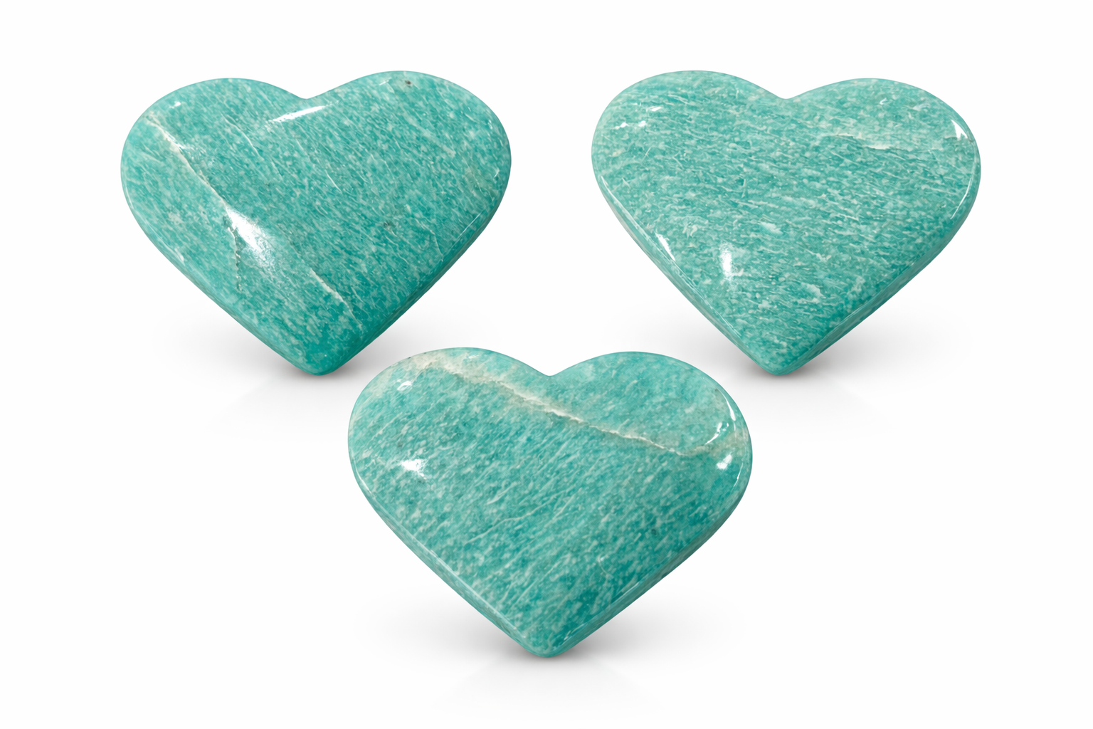 Smooth, hand-carved amazonite hearts featuring soft blue-green tones with natural white marbling unique to each piece. The polished finish enhances the stone’s natural patterns, giving every heart its own distinct look while maintaining a consistent, refined shape.