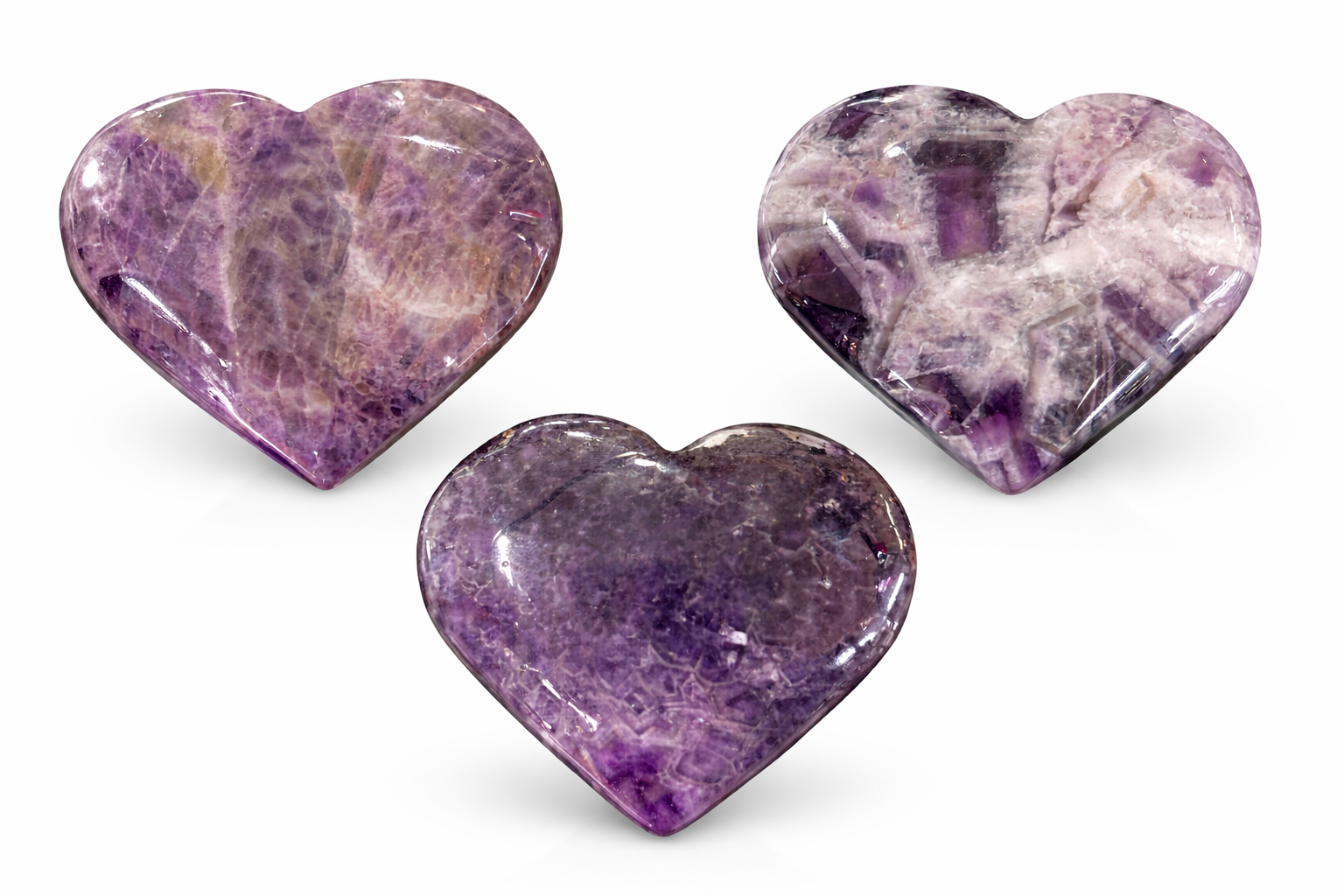 Beautifully carved amethyst hearts showcasing rich violet tones blended with natural white quartz inclusions. Each piece features unique patterning from soft, cloudy marbling to deeper banded sections, enhanced by a smooth, high-polish finish that brings out the stone’s depth and colour.
