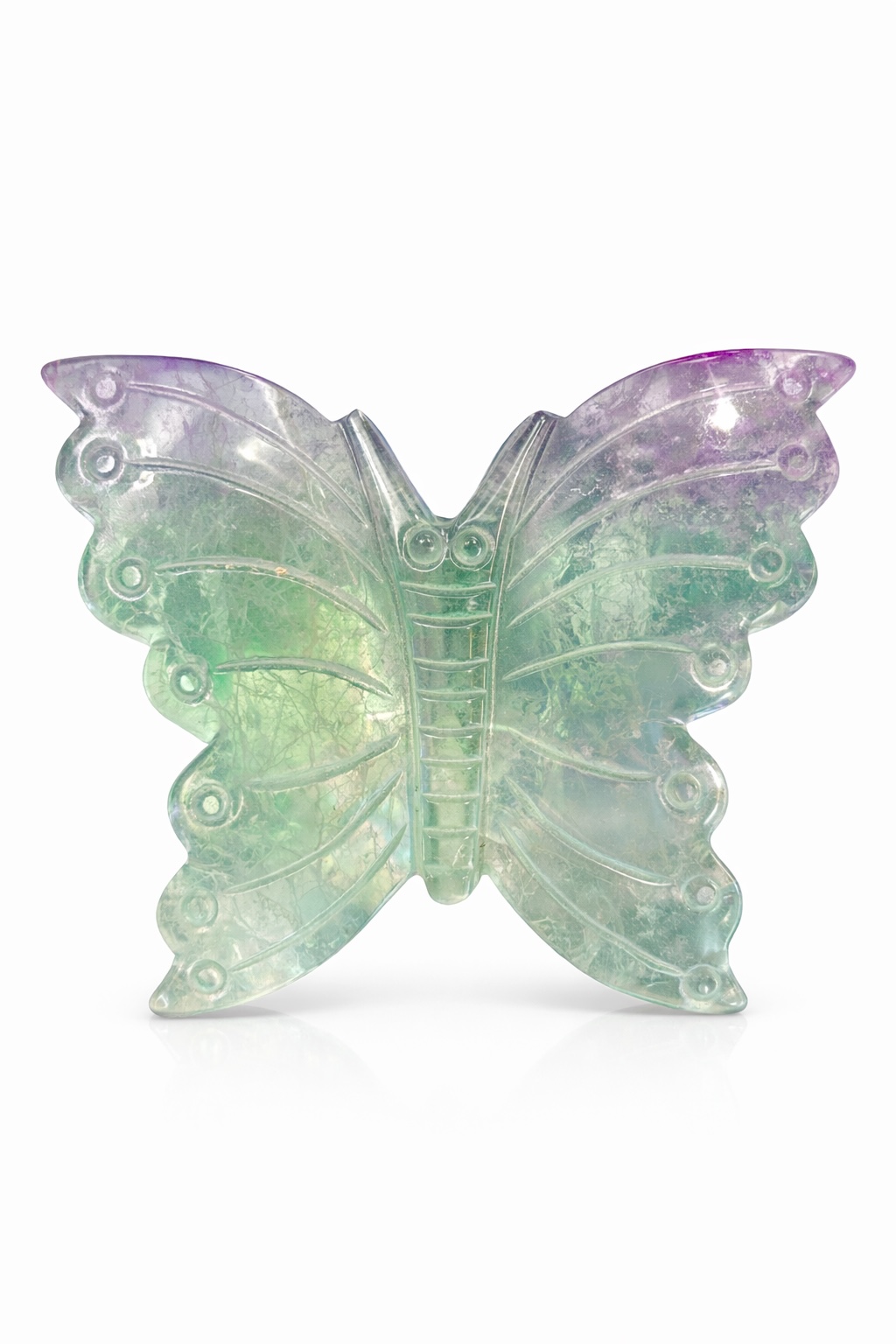 Expertly carved from natural fluorite, this butterfly features delicate wing detailing and a smooth, polished finish that enhances its soft blend of green and subtle purple tones. The stone’s natural translucency allows light to pass through, highlighting its unique internal patterns and colour variations.
