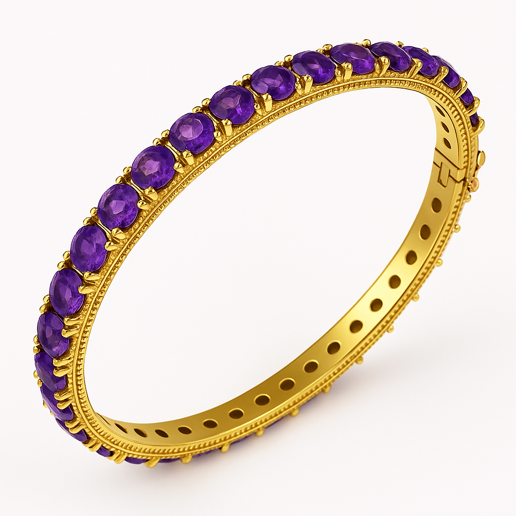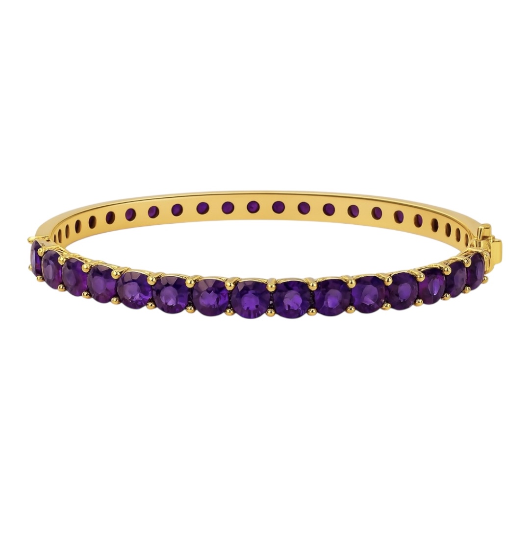 This bangle features a full circle of vibrant amethyst gemstones, each precisely cut and set in a gold-plated band. The deep purple stones are held in four-prong settings that allow light to reflect through each facet, creating a balanced mix of color and shine. Fine milgrain detailing lines the edges of the band, adding a refined touch to the bold design.