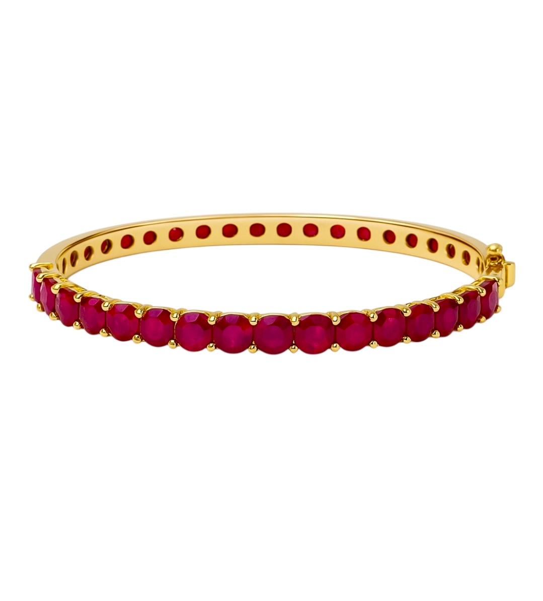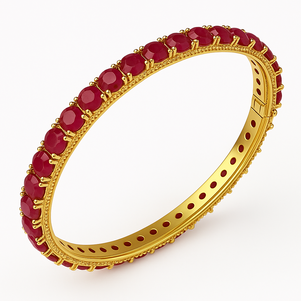 This bangle showcases a full circle of rich Burmese rubies, each precisely cut and set in a gold-plated band that go all the way around. The red stones are held securely in four-prong settings that let the light enhance their natural color and depth. Fine milgrain detailing along the edges adds texture and craftsmanship, balancing the bold color of the rubies with a refined gold finish.