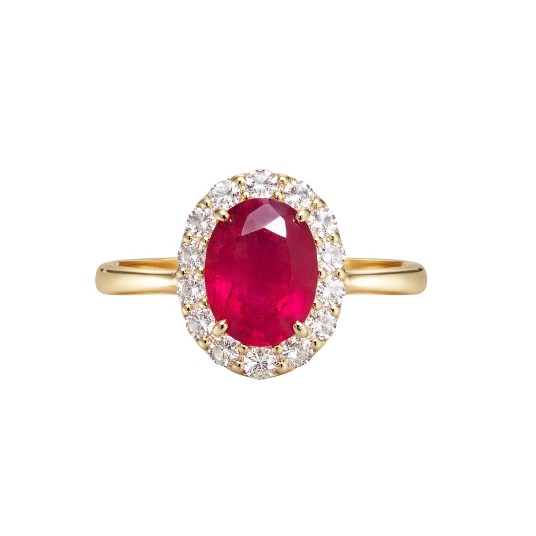 The carefully claw-set ruby allows light to pass through the stone, revealing its depth of colour and natural character. A fine diamond halo adds contrast and brilliance, while the polished gold band offers a smooth, refined finish that sits comfortably on the hand.
