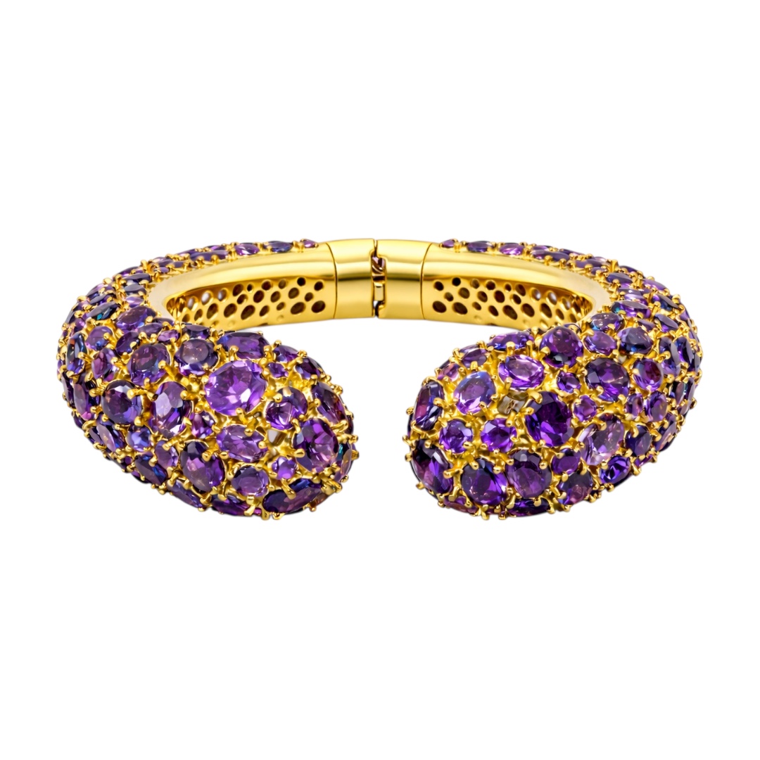 A striking gold-plated bangle adorned with richly faceted amethyst stones, arranged in a full pavé setting that wraps the piece in deep violet brilliance. The exclusive sculpted open-cuff design and intricate gold framework create a bold, luxurious silhouette, balancing opulence with elegance. Designed to make a statement, this piece radiates warmth, colour, and refined glamour perfect for evening wear or elevated styling.