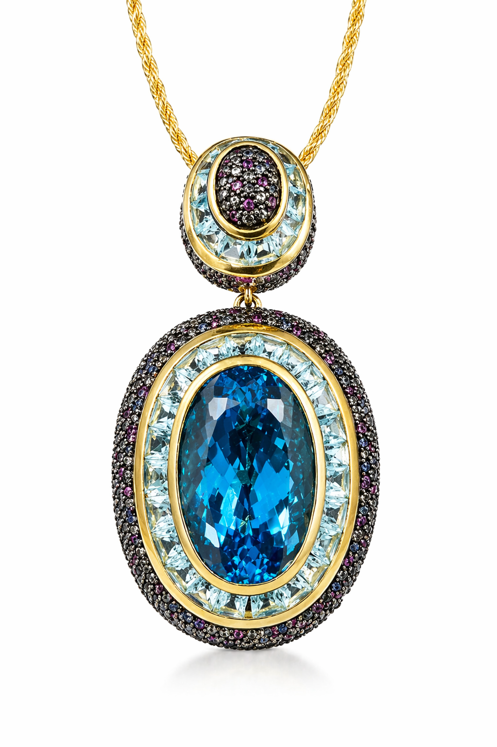 Striking in both colour and scale, this statement pendant features a vivid Swiss blue topaz at its centre, cut to maximise brilliance and depth. The intense blue hue is framed by a halo of aquamarines, creating a luminous contrast that enhances the richness of the centre stone.