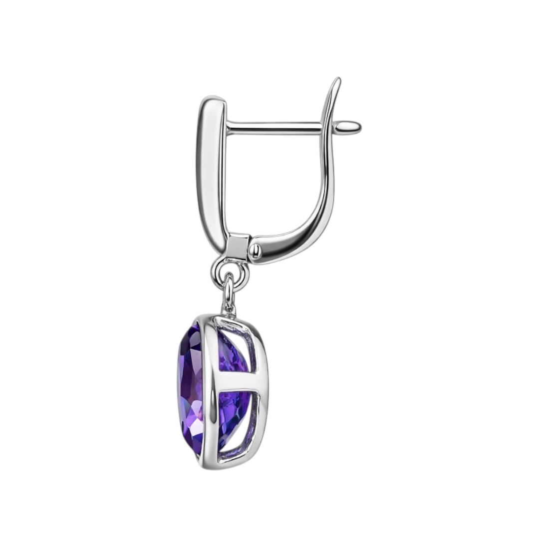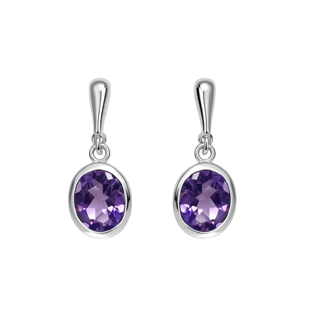 These refined drop earrings feature rich oval-cut amethyst gemstones, displaying luminous violet tones and natural brilliance. Each stone is securely set in a polished silver-toned bezel, creating a smooth, fluid silhouette that enhances the depth and clarity of the gemstone.