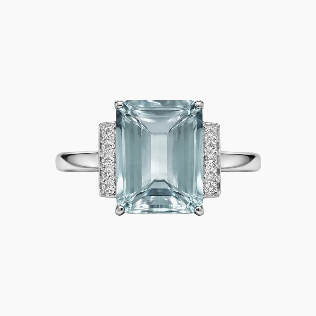 A breathtaking emerald-cut aquamarine commands attention in this architectural statement ring. The serene blue centre stone is secured in a classic four-claw setting, allowing its clean step-cut facets to reflect light with striking clarity.