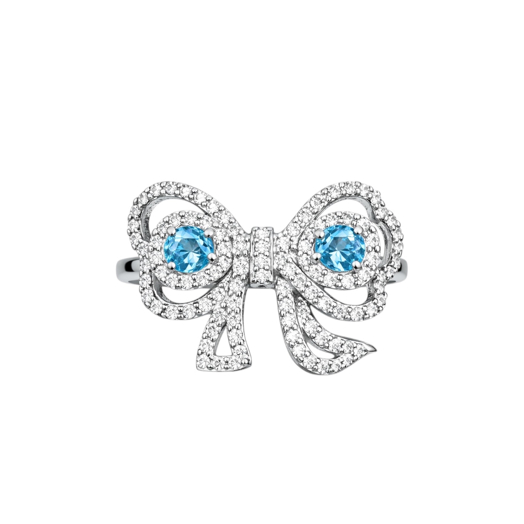 A graceful bow-shaped ring set with radiant blue topaz centres and shimmering pavé zircon accents, crafted in polished sterling silver . The soft ocean-blue gemstones are framed by flowing zircon curves, creating a luminous, delicate contrast. Feminine, fresh, and elegant, this piece offers a refined statement with a soft pop of colour.