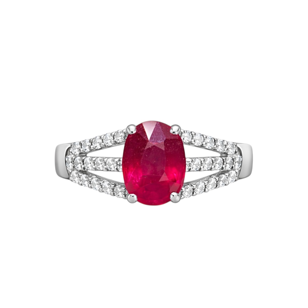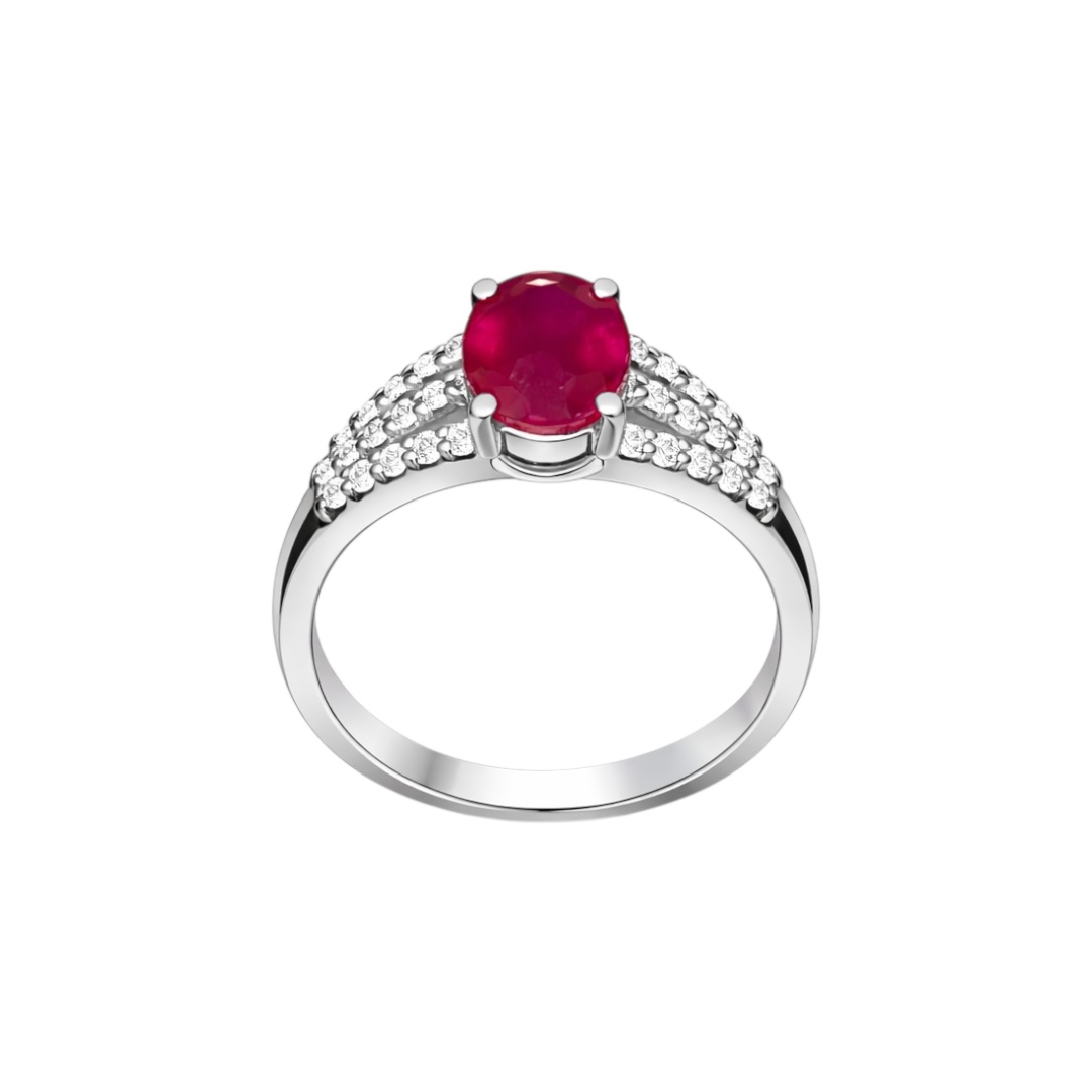A statement of passion and elegance, this exquisite ring features a vivid oval-cut ruby as its centrepiece, radiating rich crimson tones and natural depth. The ruby is securely set in a classic four-prong setting and framed by a refined split-shank band adorned with brilliant round-cut zircons , creating a striking balance of fire and sparkle.