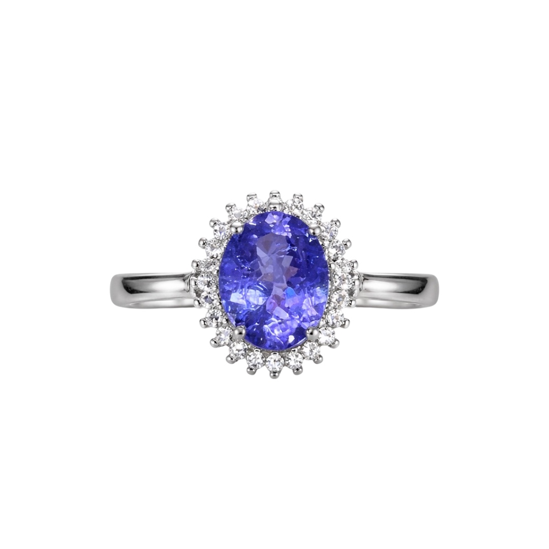 A striking oval tanzanite sits at the centre of this sterling silver ring, glowing in rich violet-blue tones that shift beautifully in the light. A delicate halo of fine white zircon stones frames the centre gem, adding extra brilliance and contrast without overpowering it.