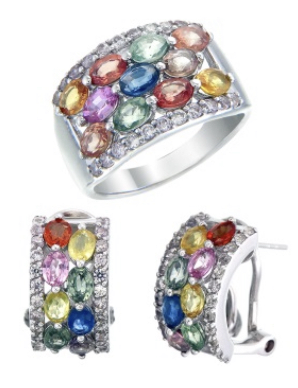 Stunning natural Multi Colour sapphires Sterling Silver earrings for pierced ears with clip setting. Pin can be removed to make clip on earrings for ladies with no pierced ears