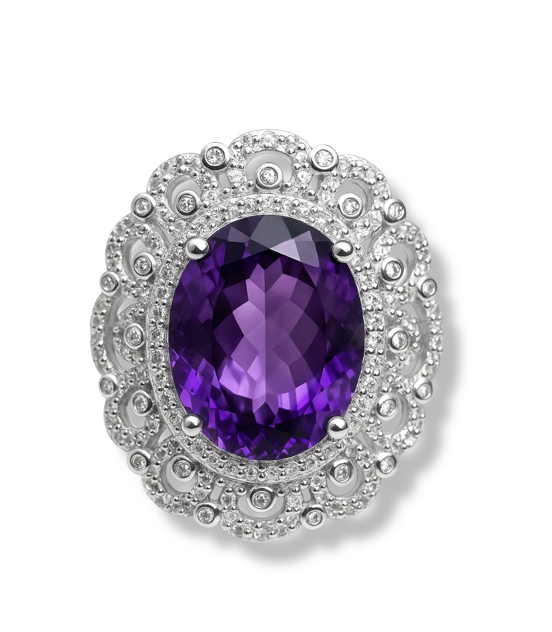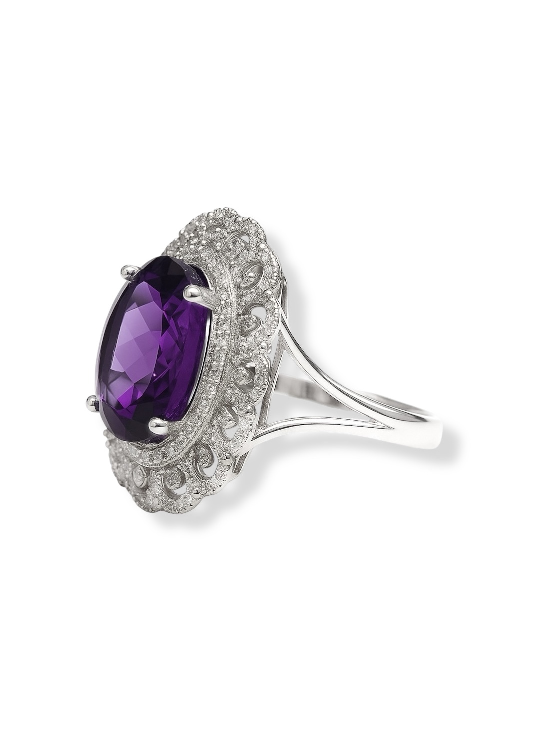 Make a statement with this breathtaking ring, featuring a vivid oval-cut amethyst at its heart. The deep, royal purple gemstone is surrounded by an intricately designed halo of sparkling white zirconias, set in a lace-like sterling silver frame that exudes vintage elegance.