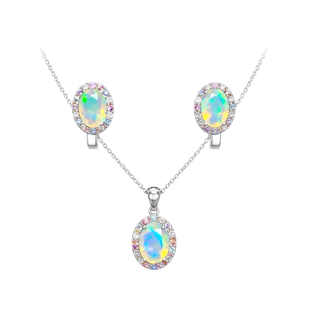 A refined opal jewellery set featuring luminous oval opals with soft flashes of green, blue, and golden hues that shift gently in the light. Each centre stone is framed by a delicate halo of multi-coloured sapphires, adding subtle tones of pink, lilac, and light blue for a soft, iridescent finish. Set in polished sterling silver, the matching earrings and pendant create a balanced, elegant look perfect for everyday wear or special occasions.